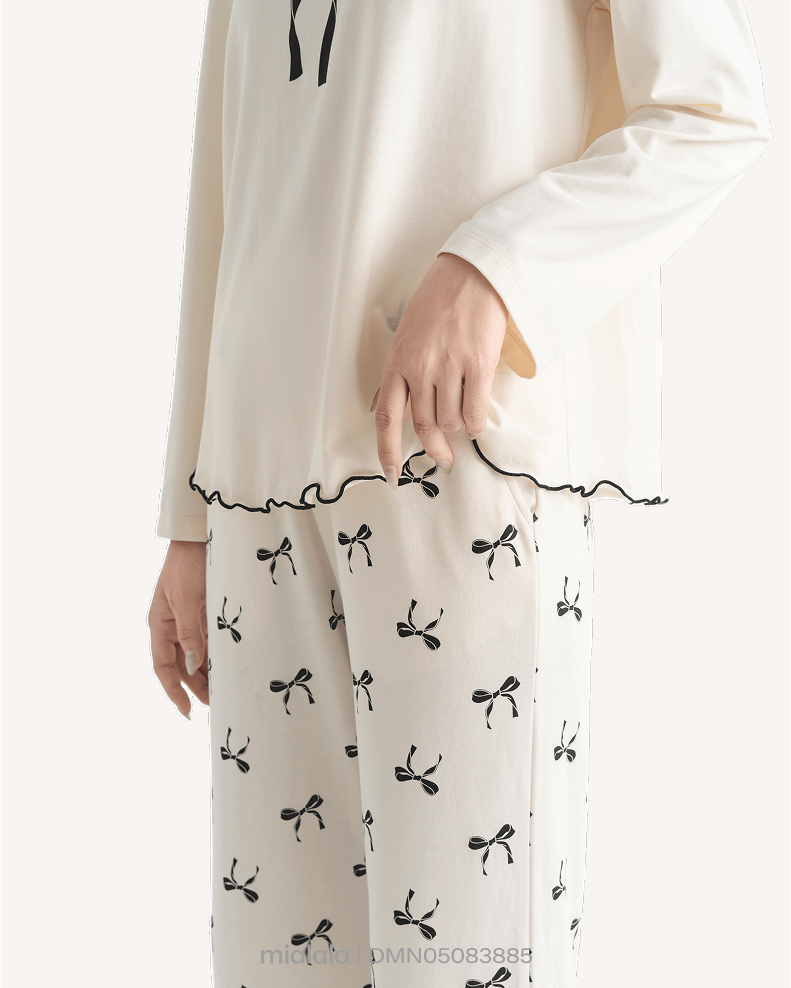 Bộ mặc nhà DMN05083885 được thiết kế với kiểu dáng trẻ trung. Tay dài, quần dài rất phù hợp với tiết trời se lạnh thu đông. Đặc biệt, quần có in họa tiết nơ trendy xinh xắn trên nền vải cotton trơn cao cấp. Áo cũng được điểm xuyết bởi nơ xinh, tôn diện mạo xinh tươi cho người mặc.