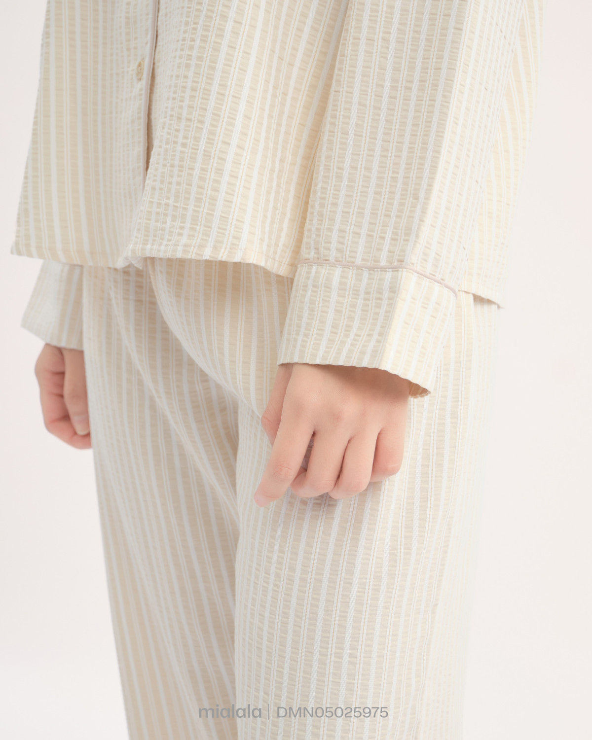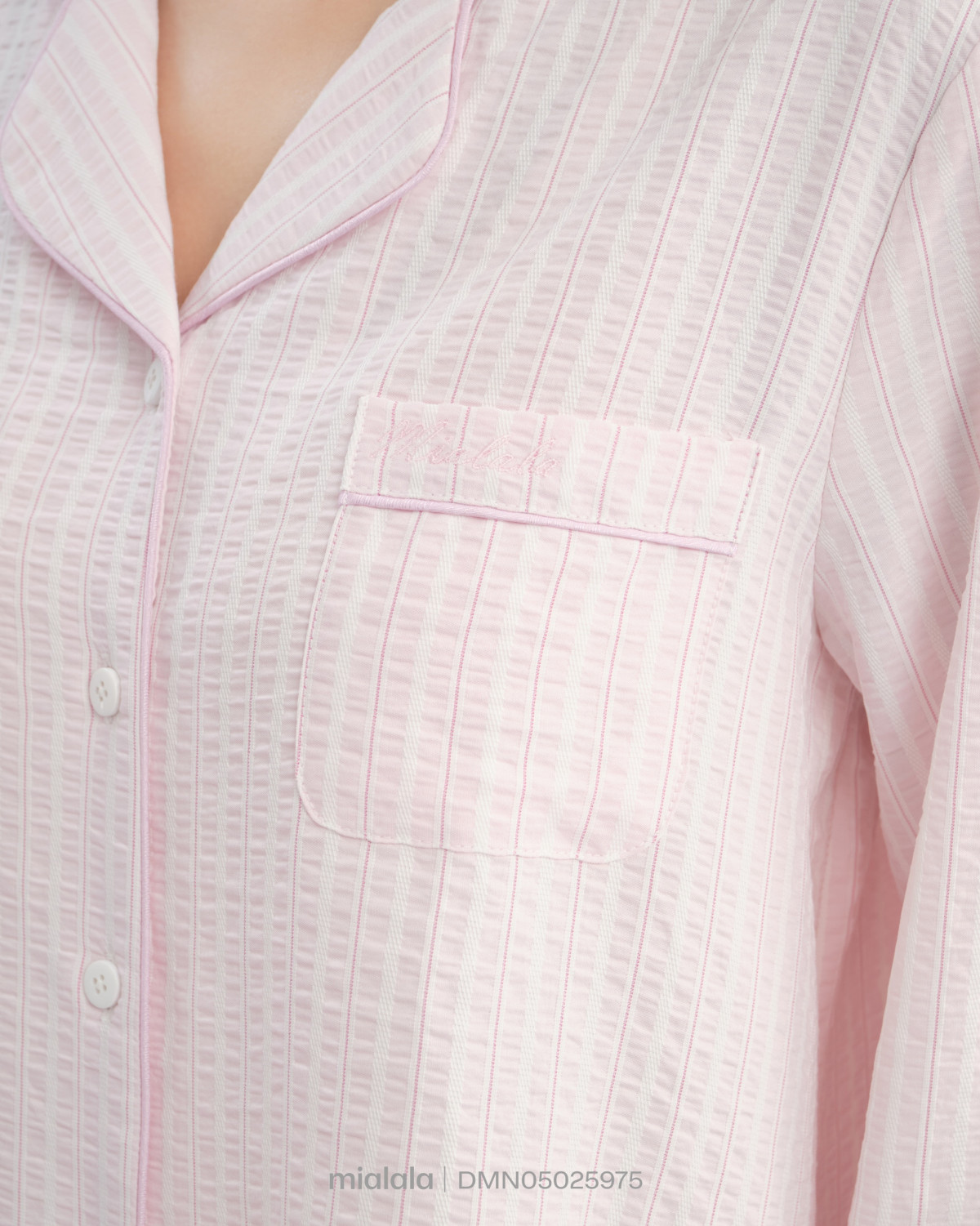 Bộ mặc nhà có họa tiết sọc kẻ xinh xắn. Họa tiết này không chỉ tạo điểm nhấn cho bộ đồ mà còn giúp bạn trông thời trang và phong cách.