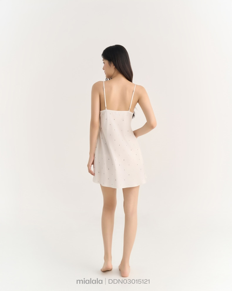 Váy ngủ lụa thiết kế 5121 ấn tượng với họa tiết chấm bi trẻ trung, phối ren đen nữ tính trên nền vải be thanh lịch. Bản phối màu độc đáo này tôn sắc vóc gợi cảm nhưng hiện đại, đầy phong cách cho chị em.